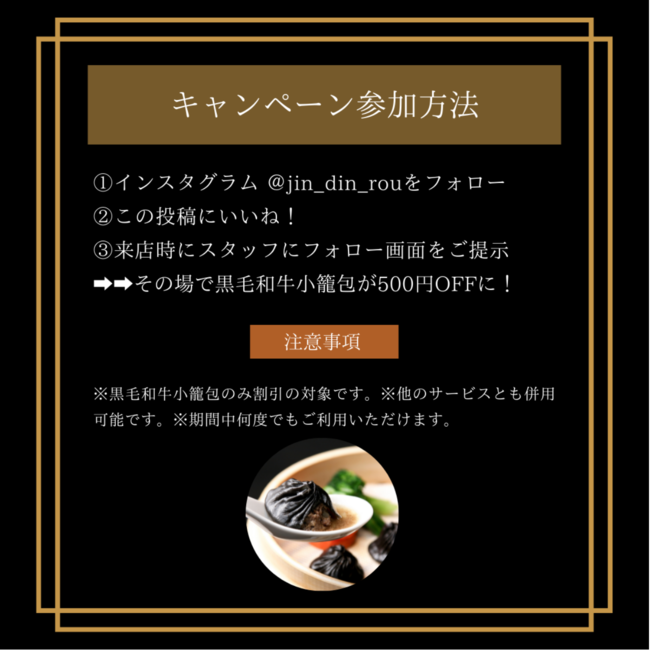 3.来店時にスタッフにフォロー画面をご提示。その場で黒毛和牛小籠包が500円OFFに!