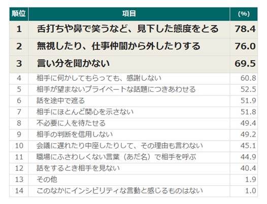 最も多い順から「舌打ち・鼻で笑うなどの人を見下した態度」「無視や仲間外れ」「言い分を聞かない」となり、いずれも70~80%前後と高い回答率となりました。