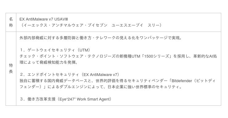 当社のサイバーセキュリティ対策製品USAVIII(ユーエスエーブイ スリー)は、本日2020年5月11日から販売を開始します。インターネットを介したサイバー攻撃を防御するUTM、自社開発エンドポイントセキュリティ製品EX AntiMalware v7(イーエックス・アンチマルウェア・ブイセブン)と働き方改革支援ソフトウェア「ワークスマートエージェント」のパッケージ製品です。企業は、USAVIII(ユーエスエーブイ スリー)の導入により、外部内部脅威に対する多層防御と、働き方・テレワークの見える化を実現できます。