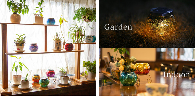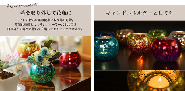 明るいお昼の時間はフタ部分だけで充電。その間に花瓶やキャンドルホルダーとして使うなど、ソーラーライトだけではない自由な使い方ができます。