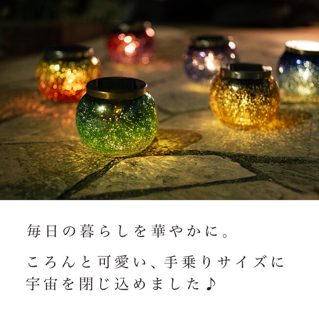 手乗りサイズに宇宙を詰め込んだような可愛いライト。 カラフルで きらびやかな見た目だから光っていない時もおしゃれな佇まいに。お庭はもちろん、デスクやベッドサイドにも置いておきたくなるほど魅力的な見栄えです。