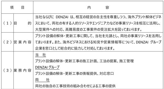 当社は、DENZAI株式会社(本社:東京都港区、本店:北海道室蘭市、代表取締役社長CEO 上村浩貴、以下「DENZAI」といいます。)との間で、海外プラントへの解体ビジネス展開について、戦略的パートナーシップ提携(以下、総称して「本業務提携」といいます。)の契約締結について合意しましたので、下記の通りお知らせいたします。