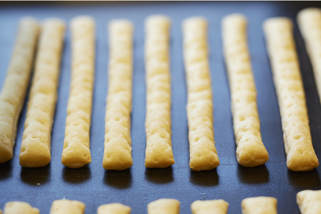 coneri 品川のスティックパイに使用するのは、国産の小麦粉や大豆を原料とした食塩不使用の酵豆粉(こうずこ)などを独自で配合した“こねり粉”。パイ生地作りの要の「こねる」「折る」「伸ばす」の工程は、熟練のパイ職人による手わざでこそ成せる業。季節・天候・温度・湿度とあらゆる些細な変化も見逃さず、生地の声に耳を傾け会話しながら、約1,000層のパイ生地に仕上げます。