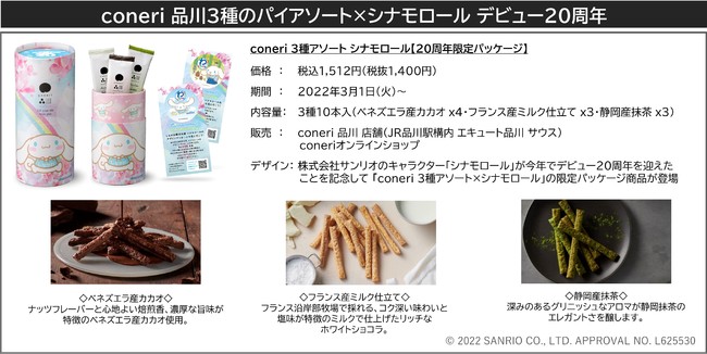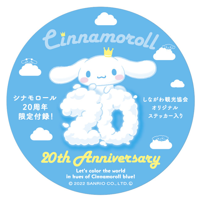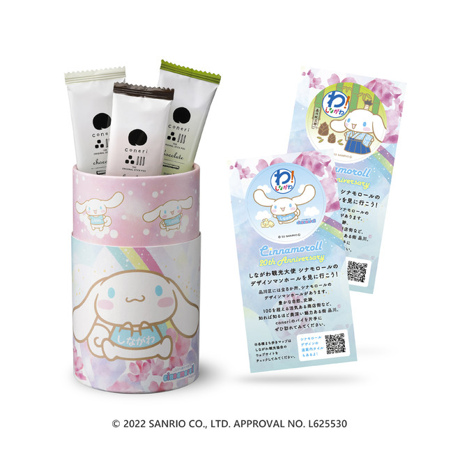 品川区・しながわ観光協会認定「しながわみやげ」であるconeri 品川は、品川の街おこしにつながる企画として2020年7月よりしながわ観光大使であるシナモロールとコラボレーションした品川限定のシナモロールパッケージを販売しています。この度、シナモロールデビュー20周年を祝して、パッケージの天面に記念シールを貼り、しながわ観光協会提供のオリジナルシール2種の封入(ランダム封入)の商品を期間限定で発売します。品川区内のマンホールのデザインでもあるこのシールは、品川の地に訪れてほしいという品川区の願いが込められています。