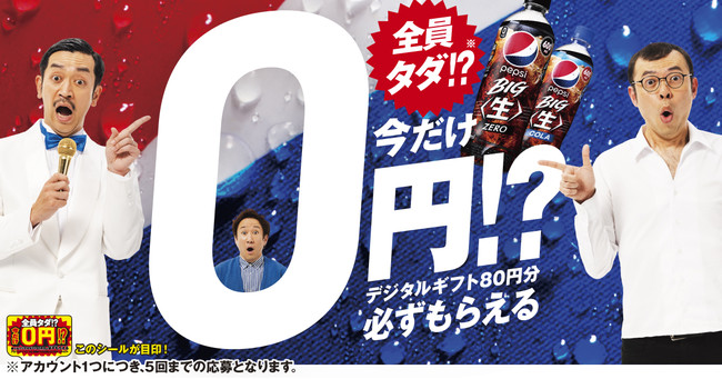 サントリー食品インターナショナル(株)は、「PEPSI」ブランドの主力商品として、3月15日(火)に「ペプシBIG〈生〉」をリニューアル発売いたします。それに伴い、多くの方にさらにおいしくなったペプシBIG〈生〉をお試しいただくために「ペプシBIG〈生〉全員タダ!?※キャンペーン」を3月14日(月)から開始します。「ペプシBIG〈生〉」を買うとデジタルインセンティブ80円分がもらえて実質0円(タダ)となりますので、この機会にぜひお試しください。