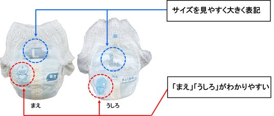 2. サイズが識別しやすく、お子さまでも紙おむつの前後がわかりやすいデザイン