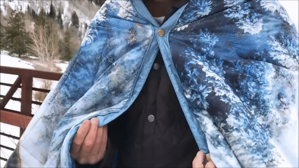 スナップを繋ぐとポンチョに返信。Pillow Blanketは防水なので、ポンチョとして使っていれば、突然の雨も心配ありません。