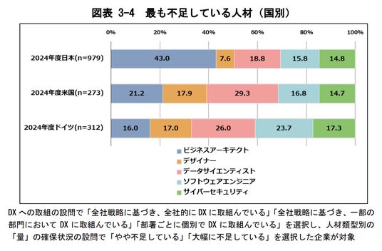 また、同調査によると、DXを推進する人材で最も不足しているのは「ビジネスアーキテクト」が43%と突出しており、DX の取組の初期段階から導入・検証までを担う人材が不足していることが DX の成果創出にも影響しているのではないかと考えられると、IPAでは分析しています。