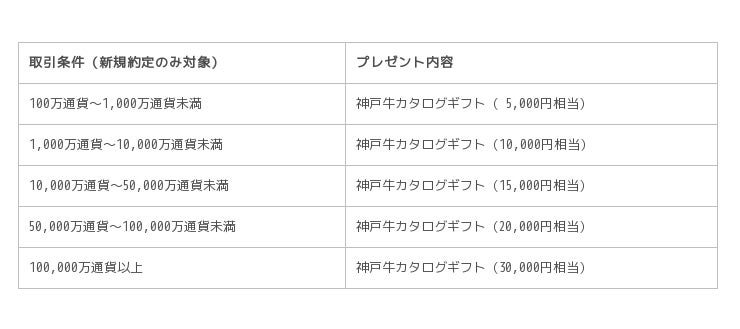 キャンペーン期間中に、キャンペーンページからキャンペーン申込をされたお客様を対象に、FXネオの取引数量に応じて「神戸元町辰屋」の神戸牛カタログギフトをプレゼントいたします。すでにFX取引口座を開設されているお客様も、新規で開設されたお客様も対象となります。