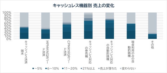 - 決済機器別では、「キャッシュレス対応の券売機」・「キャッシュレス対応の自動釣銭機」の設置によって売上増加に繋がったとの回答が多かった。