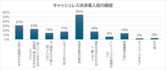 キャッシュレス決済導入前の主な障壁としては、経済的要因(決済手数料の負担(55%)、入金に時間がかかる(31%)、初期費用が高い(14%))が主たる回答となりましたが、心理的な障害(新規導入の手続きの煩わしさ(23%)、操作方法が分からない(18%)、セキュリティが不安(17%))も多くの割合を占めました。