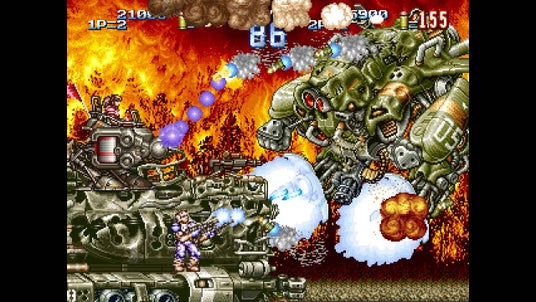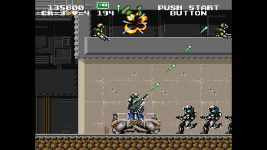 海外では"GunForce II"として発売された「ジオストーム」は、アーケードおよびスーパーファミコンで発売された「ガンフォース」の続編ですが、前作からあらゆる面が強化されています。特に常に画面のいたるところが爆発していると言っても過言ではないド派手なバトルが魅力です。また職人芸の域に達した、描き込まれたドット絵はもはや芸術と言えましょう。「ジオストーム」は名作揃いの旧アイレムの作品群の中で、最後にリリースされたアーケードゲームとされています。本作は「ガンフォース」同様、二人同時プレイに対応しています。