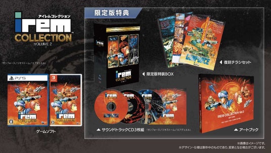 Nintendo SwitchとPS5向けには同2024年11月28日に「アイレムコレクションVol.2」パッケージ通常版を4,400円(税込)で、豪華な特典付きのパッケージ特別限定版を9,350円(税込)で発売予定です。パッケージ通常版および特別限定版は2024年8月29日より各販売店で予約受付を開始致します。特別限定版はゲーム本編のほか収録タイトルの豪華サウンドトラックCD3枚組、アートブック、復刻版チラシセットなどの限定グッズを同梱したアイレムファンに向けたコレクターアイテムです。販売店オリジナル特典もございますのでこちらも是非チェックして下さい。