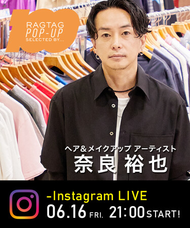 6月16日(金)21:00から、RAGTAG渋谷店に奈良さんをお招きして、おすすめ商品やその着こなし方などをご紹介いただく、「RAGTAG100」がより深く楽しめるインスタライブを開催。インスタライブはRAGTAG Instagram(@ragtag_official_men https://www.instagram.com/ragtag_official_men/)から配信予定です。