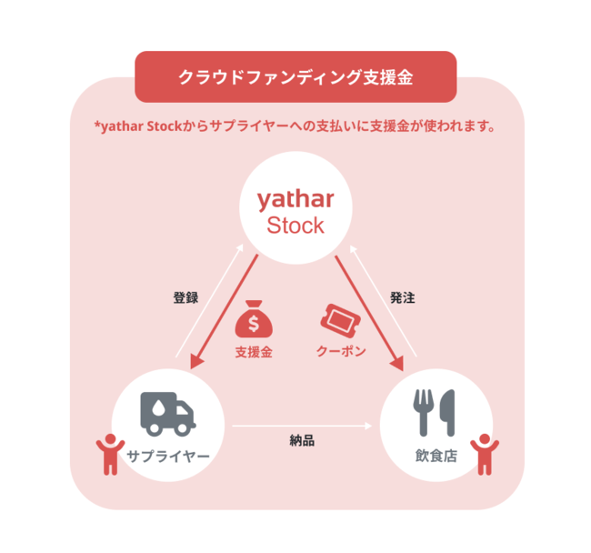 さらに、一時的な支援で終わらせないために、飲食店とサプライヤーを結び付ける注文~配送・在庫管理のプロセスを仕組み化することで(仮称:yathar Stock)、サステナブルな経済循環に貢献します。