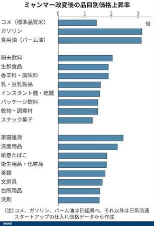 日経新聞によると、「ミャンマー人の主食であるコメの市場価格は平時より4割高い水準に達した。」と言います。油やガソリンは3倍以上の上昇となっていることが分かります。