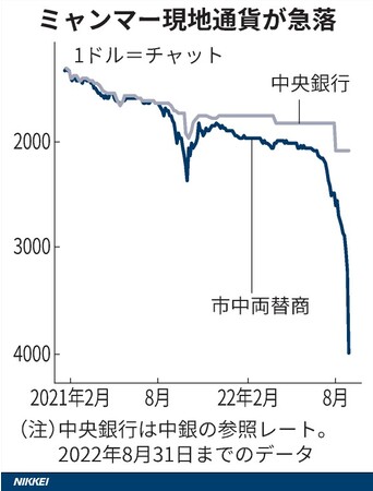 更に、ミャンマーの現地通貨であるチャットは2022年8月に入り急落。日経新聞によると、「8月初めから40%近く下落していた」と言います。