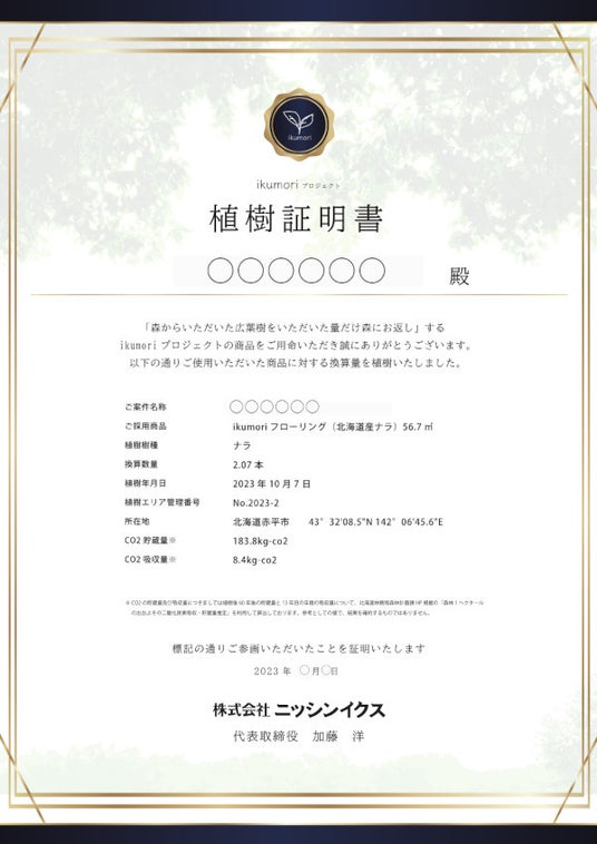 株式会社ニッシンイクス(本社:山口県周南市、代表取締役:加藤洋)は、北海道産広葉樹を使用し、使った分量に見合う広葉樹を再び北海道に植樹するエシカルインテリアブランド『ikumori』の新たなサービスとして植樹証明書の発行を開始しました。エンドユーザー様へ進呈することで環境保全への貢献をより身近に感じて頂いたり、企業のCSR活動の証明としての利用など幅広いシーンでご活用いただけます。詳細についてはikumoriサイトをご覧ください。【https://ikumori.jp/】