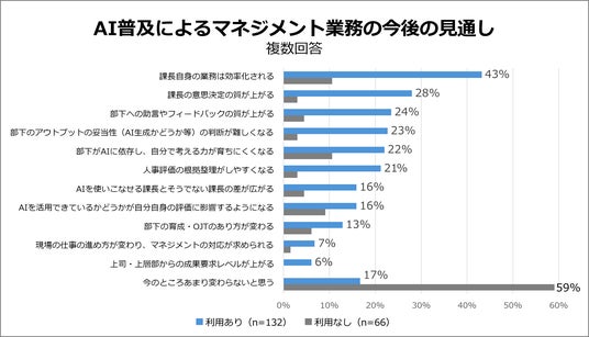 AI普及によるマネジメント業務の今後の見通しについて調査(複数回答)し、AIを月に数回以上利用している132人、と現在利用していない66人に分けて集計しました。