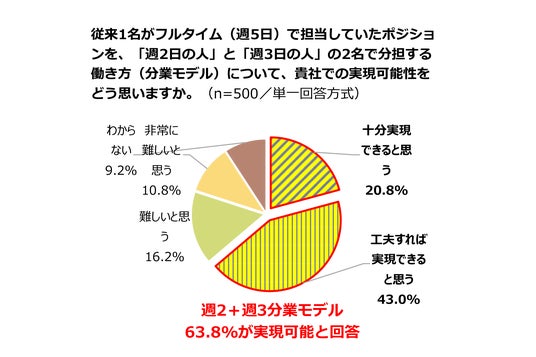 一方で、従来1名がフルタイムで担当していたポジションを「週2日の人」と「週3日の人」の2名で分担する働き方(分業モデル)について聞いたところ、「十分実現できると思う」(20.8%)と「工夫すれば実現できると思う」(43.0%)を合わせ、63.8%の企業が実現可能と回答しました。