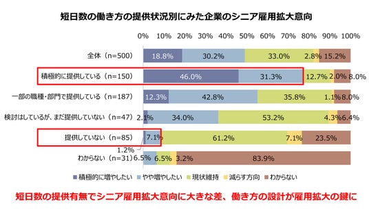 シニアへの短日数の働き方を「積極的に提供している」と回答した企業では、77.3%が今後のシニア雇用について「積極的に増やしたい」または「やや増やしたい」と回答しました。一方、「提供していない」企業では8.3%にとどまり、働き方の選択肢の有無とシニア雇用拡大意向との間に大きな差がみられました。