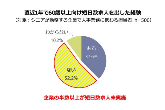 第一弾調査では、勤労意欲のある非就業シニア(n=200)の72.0%が『週4日以下』であれば無理なく働き続けられると回答しました。一方、本調査では、60歳以上向けに『週4日以下』などの短日数求人を出したことがない企業が52.2%にのぼり、シニア側が無理なく働き続けられる条件と企業側の求人設計との間にギャップがあることが明らかになりました。