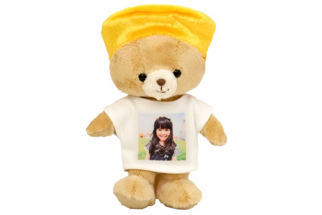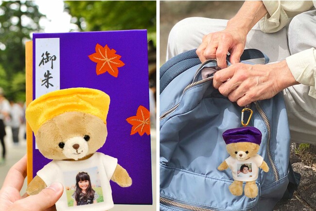 「元気長寿オマモリまごベア」は、お孫さんの写真入りTシャツを着たテディベア。お孫さんと一緒にお出かけ気分を味わえる小さなマスコットテディベアです。