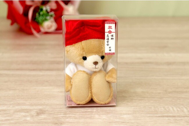 「元気長寿オマモリまごベア」はお祝いに合った色の頭巾を贈る昔からの風習を今風にアレンジした、ベレー帽を着用。