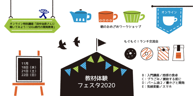 2日間で8コマのワークショップのほか、オンライン特別講座を開催します。開発教育の新作教材や定番教材をオンラインで体験し、参加型学習(アクティブ・ラーニング)で、グローバルな課題を楽しく・深く学ぶためのヒントが得られます。