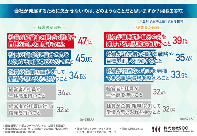 株式会社エスシーシー(本社:東京都中野区、代表取締役社長:松尾泰、以下:SCC)は、創業50周年、未来社会の到来を前に、4月3日よりコーポレートサイトをリニューアルし、SCCが目指す先として新たに制定した「夢・志」に向けて動き出します。SCCは経営者がミッションやビジョンを掲げ、社員と共有することが重要であると考えます。SCCでは、「夢・志」の本格始動に伴い、会社と社員のエンゲージメントを高めるためには何が必要か、経営者と会社員のそれぞれ500名を対象に「企業エンゲージメント力」に関する調査を実施しました。