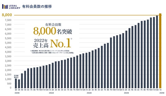 「LEGAL LIBRARY」は、おかげさまで8,000名を超える有料会員様にご利用いただいており、法律文献を横断的に検索・閲覧できるリサーチサービスとして2022年の売上高No.1(※)となっております。
