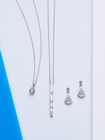 ドレスの裾を広げたような優雅なフォルムにダイヤモンドが煌めくイチョウの葉モチーフにしたネックレスとピアスや、すっきりとしたストレートラインが洗練されたデザインのネックレス、瑞々しく丸みのあるドロップフォルムが美しいネックレスなどが新作として登場。