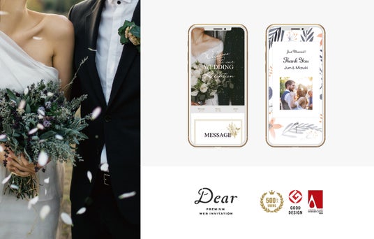 当社は、2014年より業界のパイオニアとして結婚式向けのWEB招待状サービス「Dear」の提供を開始。格式高い式場をはじめ、グローバルブランドのホテルでも利用いただける高品質のWEB招待状として、累計500万人以上の方々にサービスをご利用いただいてまいりました。また、WEB招待状サービスにおいて、グッドデザイン賞(日本)をはじめ、A’Design Award(イタリア)といったデザイン賞を唯一受賞しているサービスです。