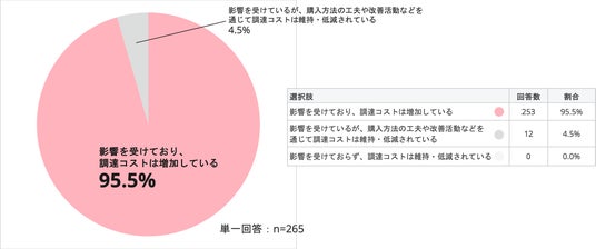 調査結果によれば、約95%が物価上昇の影響によって調達コストが増加していると回答しました。