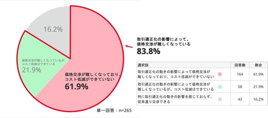 回答者の約8割が取引適正化の影響によって価格交渉が難化と回答。さらに約6割が価格交渉の難化に伴い、コスト低減ができていないと回答している。