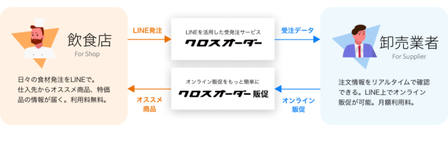 飲食店様と卸売業者様をつなぐ受発注プラットフォーム「クロスオーダー」は、これまでFAXや電話が主流だった卸売業者様の受注業務をスマートフォン上のLINEのインターフェース(画面と操作)を通じて行うことで、業務効率化を実現するサービスです。また、卸売業者様が非対面で取引先へ商品提案ができる「クロスオーダー販促」では、卸売業者様へウィズコロナ時代における新しい営業手法を提供しています。