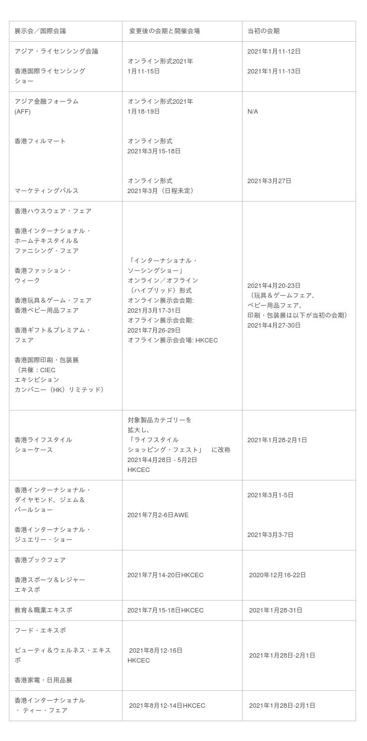 「フード・エキスポ」と3つの同時開催B to C展示会は、来場者と出展者双方の安全を最優先に考えた結果、2021年後半に延期することが決まりました。また、「教育&職業エキスポ」は、「香港ブックフェア」および「香港スポーツ&レジャーエキスポ」(2021年7月14-20日)の会期に合わせて、7月15-18日の開催に再スケジュールされ、香港コンベンション&エキシビションセンターにて開催されます。詳しくは下表をご参照ください。