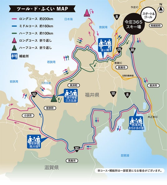 ロングとミドルは、今庄365スキー場から滋賀県の琵琶湖北岸などを通り、再び福井県に入って三方五湖や若狭湾などを通るルート。国の「ナショナルサイクルルート」に指定されている琵琶湖一周コースの「ビワイチ」、同ルート指定を目指す若狭湾サイクリングルート(愛称・わかさいくる)の一部を組み込みました。 ロングは全国屈指の走行距離で、ミドルを含め走り応えのあるアップダウンも楽しめます。 ハーフは敦賀市、美浜町を経て若狭町の道の駅三方五湖で折り返します。ルートの詳細は大会公式ホームぺージで確認できます。補給所はロングとミドルで4カ所、ハーフで2カ所設置し、ご当地補給食を満喫してもらえます。