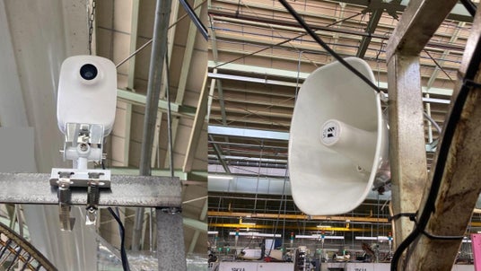 - AIカメラ(写真左):製造ラインの状態とカメラ映像のリアルタイム分析結果から、ラインの状態を判断、適切なタイミングでスピーカーに音声信号を出力。