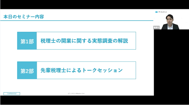 セミナーは2部構成で行われ、第1部では当社の岩原 巧(マーケティンググループ マネジャー)が登壇し、当社が開業税理士200人へアンケート調査を行った「税理士の開業に関する実態調査」について解説しました。