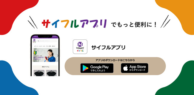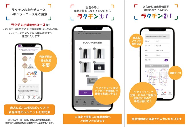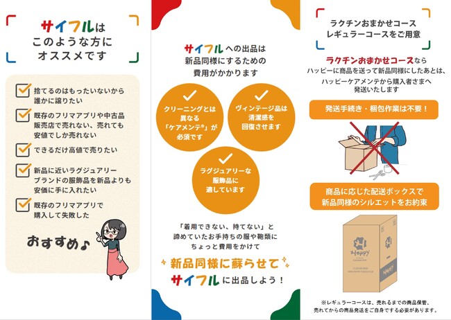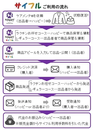 「Happyサイフル(R)」は、くたびれた服飾品を、当社ハッピー独自の衣服再生産技術「ケアメンテ(R)」によって未使用品のように清潔感のある状態に蘇らせてから出品できるのが特徴の中古ファッションフリマサービスです。当社「ハッピー」が責任を持って、新品同様に蘇らせた服飾品の限定商品を個人間で売買できる“場”を提供します。