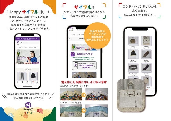 中古ファッションフリマでお小遣い稼ぎ!「Happyサイフル(R)」は、使用感のある高級ブランド衣料やバッグ等を「ケアメンテ(R)」で蘇らせてから個人間で売買できる新しいフリマサービスです。