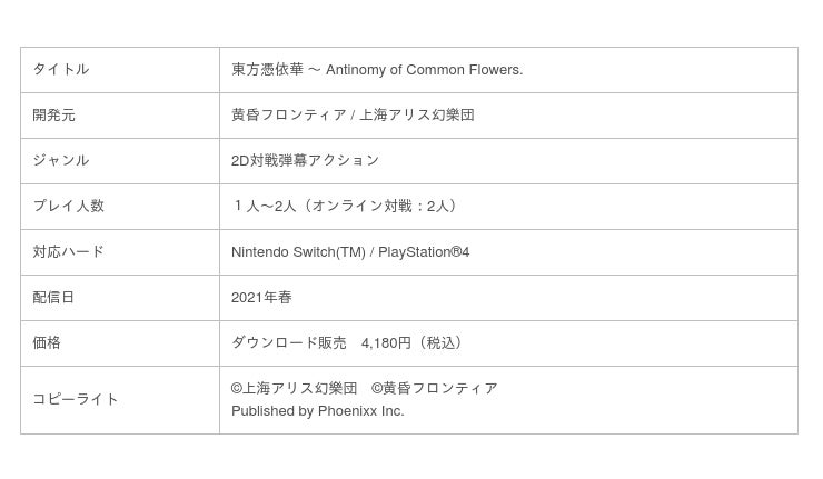 株式会社Phoenixx(東京都千代田区、代表取締役社長:坂本 和則)は、「東方Project」の公式作品第15.5弾、原作者ZUN氏監修の元でストーリーが織り込まれ、“黄昏フロンティア”が制作する『東方憑依華 ~ Antinomy of Common Flowers.』のNintendo Switch(TM)版 / PlayStation(R)️4版を、2021年春に配信することをお知らせいたします。