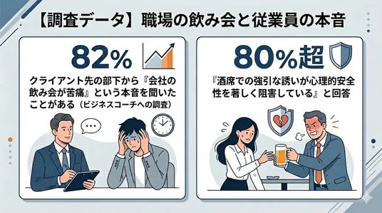 さらに同様に、8割超のコーチが、「酒席での強引な誘いが、職場の心理的安全性を著しく阻害している」と警鐘を鳴らしています
