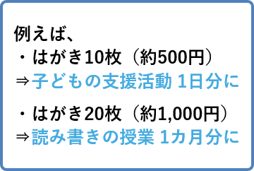 不要なはがき10枚(約500円)が、支援センターを1日運営できる費用相当になります。はがき20枚では、読み書きを学ぶ授業を1ヶ月実施できる費用に相当します。(教材費などに充当)子どもの中には、そもそも自分の意思を親や雇用主にうまく伝えることができない子もおり、教育支援を通じたコミュニケーション能力の向上が、児童労働・児童婚の回避に実際に繋がっています。