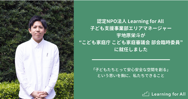 「子どもの貧困に、本質的解決を。」をミッションに掲げる認定NPO法人Learning for All (以下、LFA)子ども支援事業部エリアマネージャー宇地原 栄斗(うちはら えいと)が、2023年4月21日(金)付で”こども家庭審議会 部会臨時委員”に就任しました。