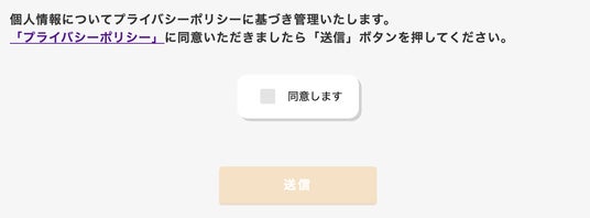 フォーム作成の際に個人情報の取扱いについての説明(プライバシーポリシー)および同意を確認する仕組みとして「同意ボタン設置機能」がご利用いただけます。同意ボタンを押下しない場合は送信できない仕様となります。