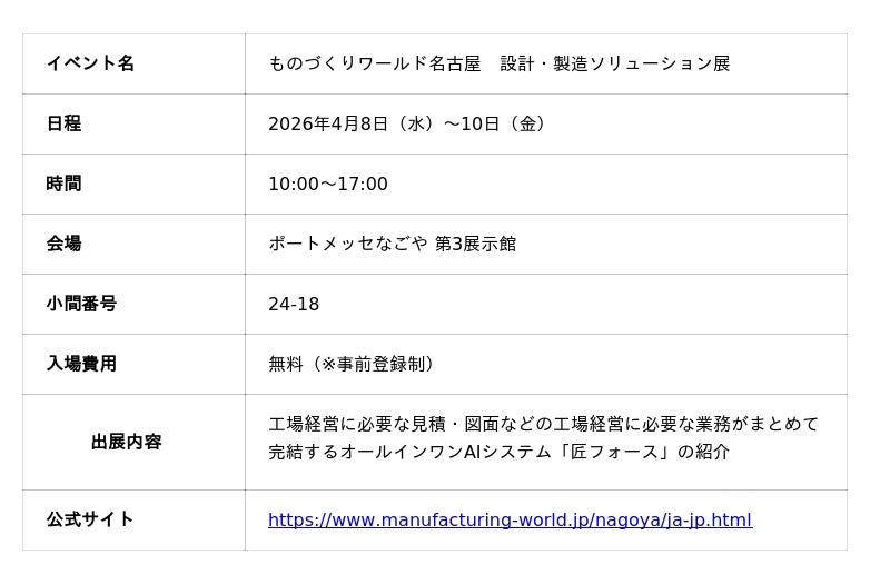 匠技研工業株式会社は、2026年4月8日(水)~10日(金)にポートメッセなごやで開催される「ものづくりワールド名古屋2026(設計・製造ソリューション展)」に出展します(小間番号:24-18)。