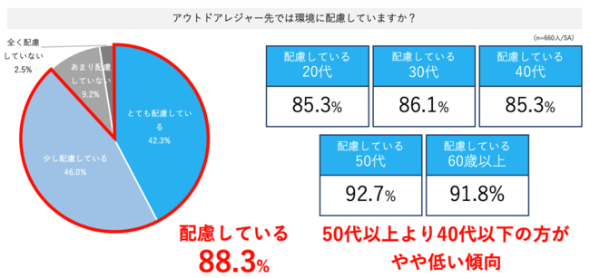 ・レジャー先でも環境に配慮している人は88.3%。どの年代も環境への配慮が高い傾向にあるが、年代別で見ると、50代以上より40代以下の方がやや低い傾向。
