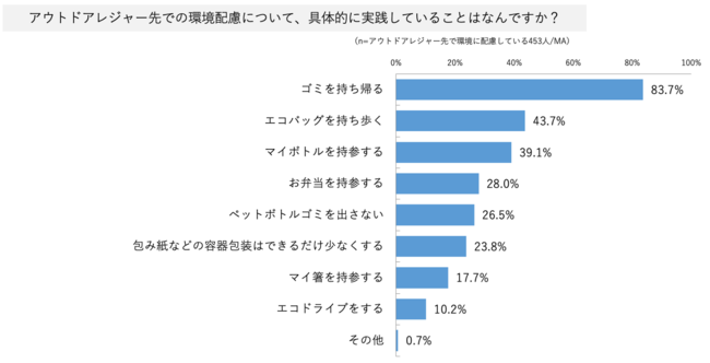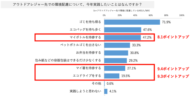 ・レジャー先での環境配慮について、実践していること第一位は「ごみを持ち帰る」、第二位は「エコバッグを持ち歩く」、第三位は「マイボトルを持参する」。また今年実践したいことについては、「マイ箸を持参する」「エコドライブをする」に続き、「マイボトルを持参する」が増加傾向に。マイボトルの持参する人は約半数に上った。
